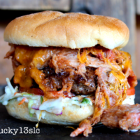 BBQ PULLED PORK BURGER!! 7oz of delicious chopped chuck topped with smoked pulled pork mixed to a saucy BBQ perfection and melted cheddar cheese on a pile of our house made cilantro coleslaw and stuffed into a fresh locally baked French...