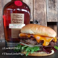 THREE LITTLE PIGS BURGER!! A wild boar patty, seasoned perfectly with our special blend of wild game seasonings topped with grilled Black Forest ham, our signature house smoked bacon and melted cheddar cheese on a bed of sweet baby greens, juicy tomato and onion slices in a fresh locally baked...